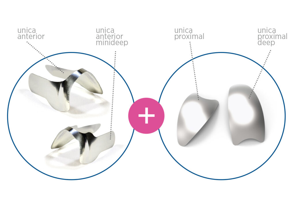 Las matrices Unica y Unica Minideep son particularmente útiles en restauraciones que implican las zonas cervical y proximal (carilla completa). Por su parte, Unica Proximal —con versiones estándar y Deep— está diseñada para reconstruir solo los márgenes interproximales, sin afectar la región cervical. Así facilita un acceso despejado y una visibilidad óptima incluso al trabajar en las zonas mesial y distal al mismo tiempo.